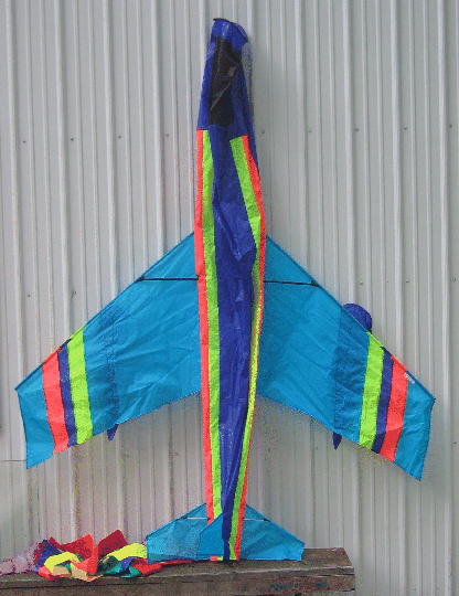 Seller #: 23 Item: Jetliner Type: Single Line Manufacturer: Go Gly A Kite Sail: Ripstop Nylon Frame: Fiberglass Wingspan: 7' X 7' Orignal Cost: ? Condition: Very good Comments: This is a 3D kite. Nose has ring allowing body to inflate. Jet engines under wing inflate also. Sale Price: $55.00 |